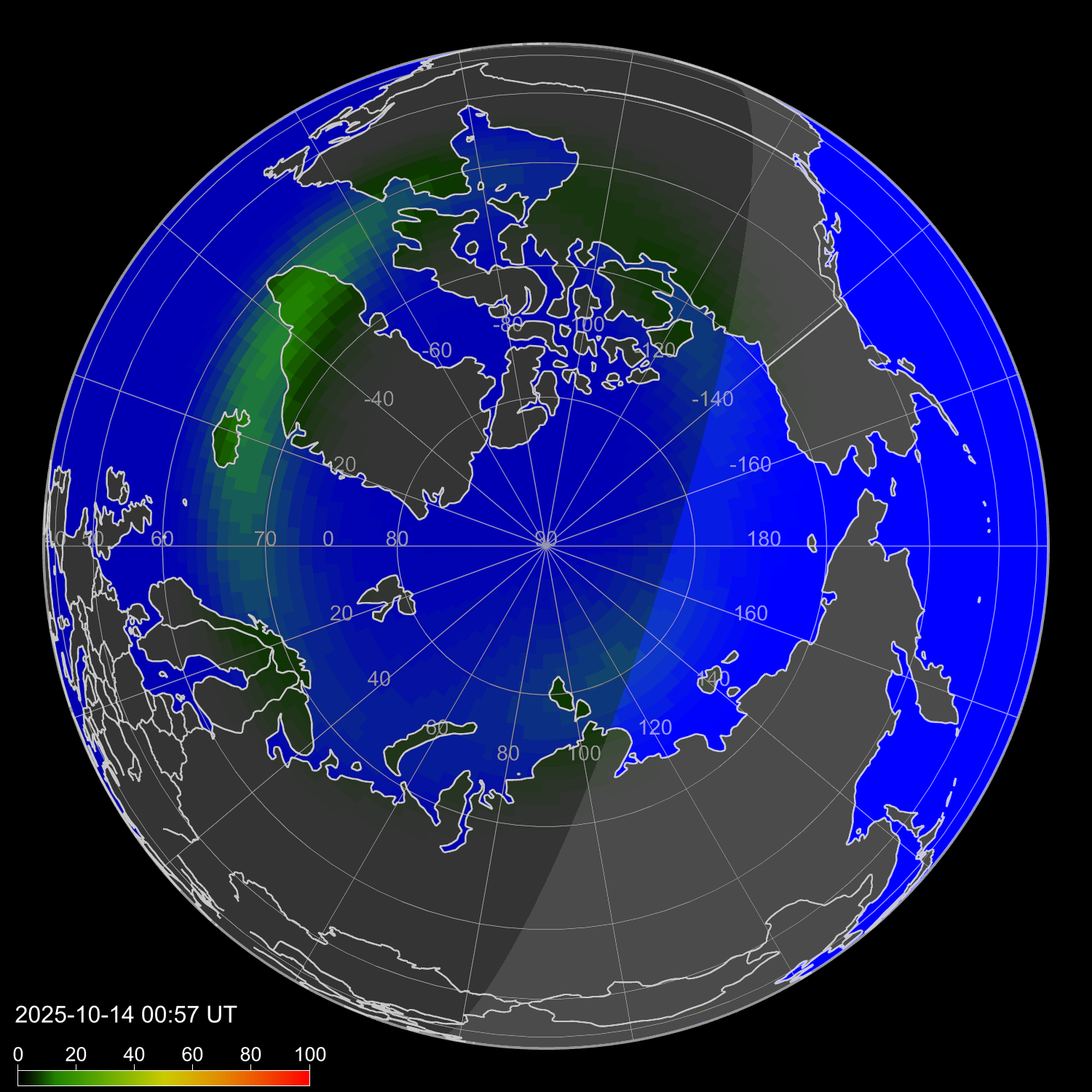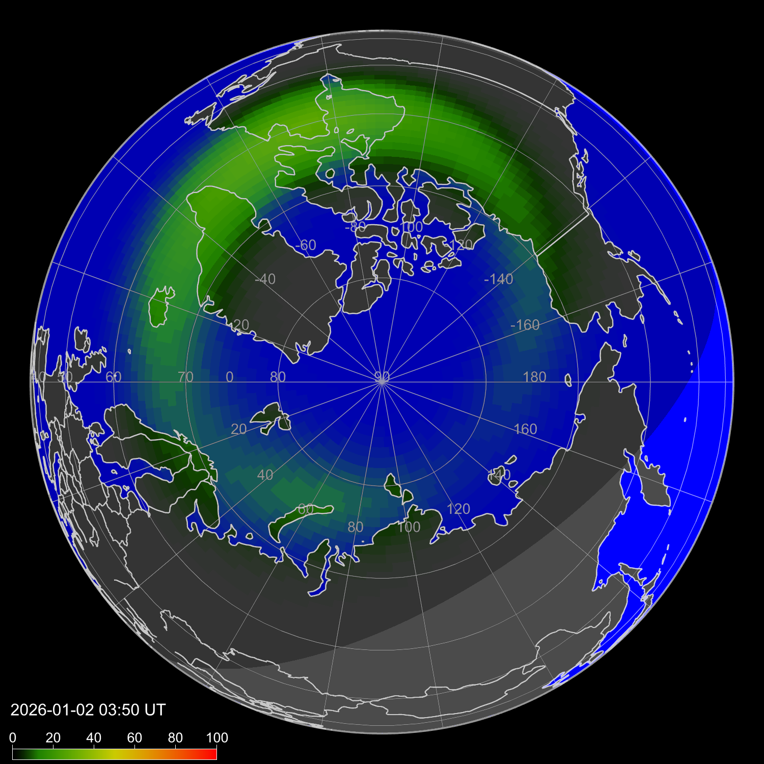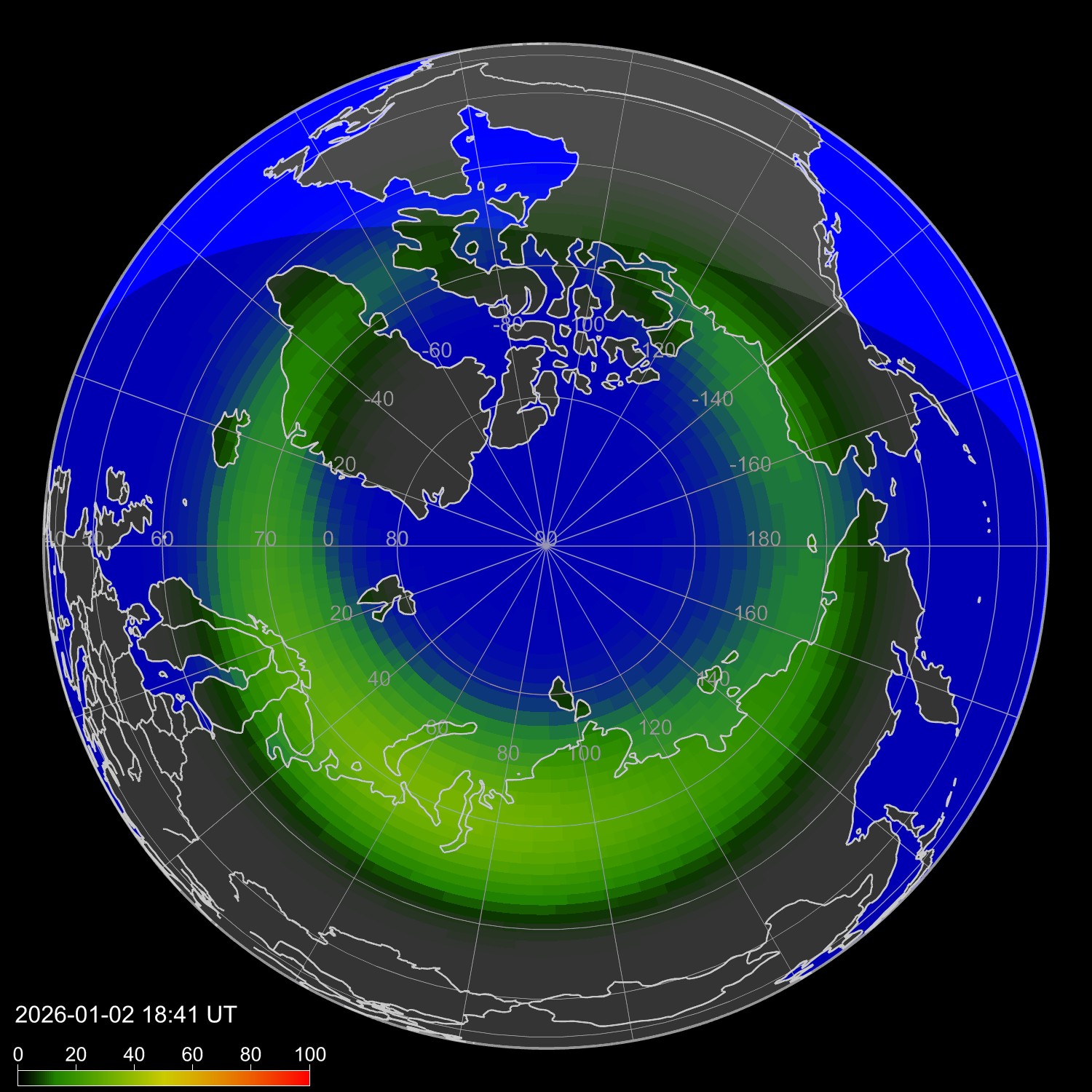 Индекс интенсивности полярных сияний и теоретически возможная широта наблюдений для ночного времени в западном полушарии