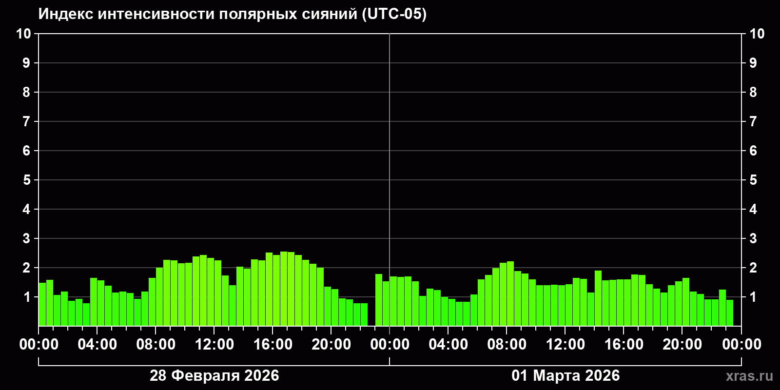 Изменения индекса интенсивности полярных сияний с 2026-02-28 по 2026-03-01 по местному времени