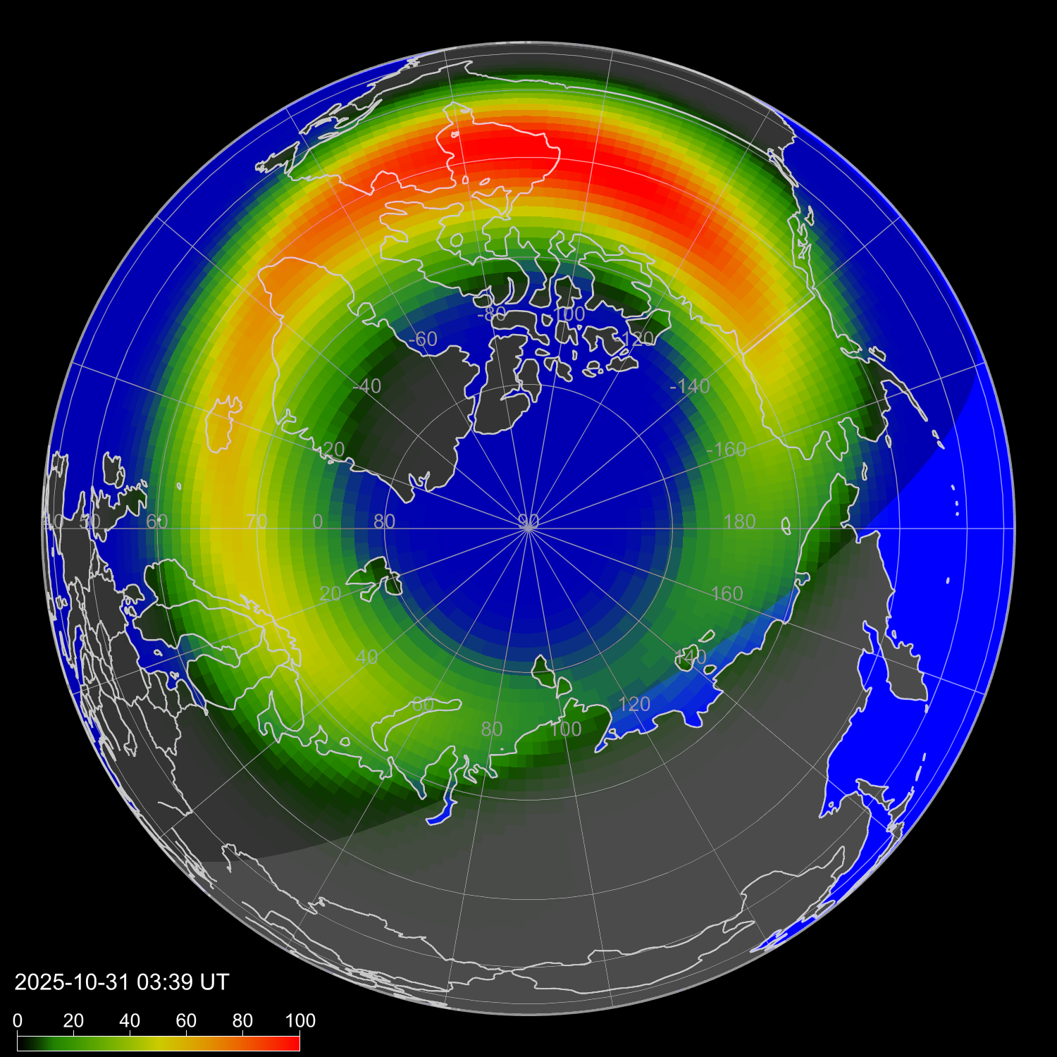 Изменения и часовой прогноз индекса интенсивности полярных сияний с 2025-10-30 по 2025-10-31