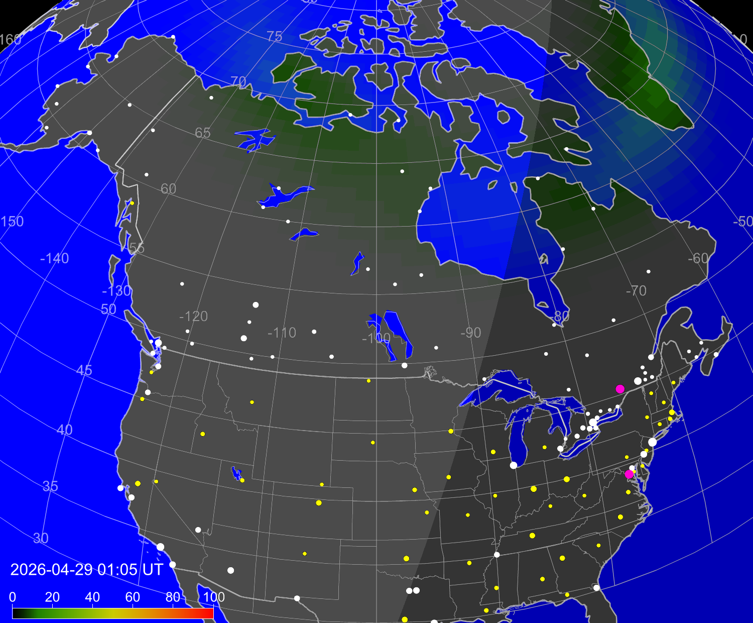 Индекс интенсивности полярных сияний и теоретически возможная широта наблюдений для ночного времени в западном полушарии