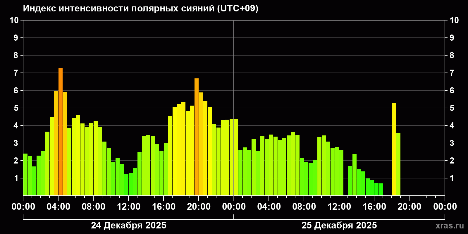 Изменения и часовой прогноз индекса интенсивности полярных сияний с 2025-12-23 по 2025-12-24