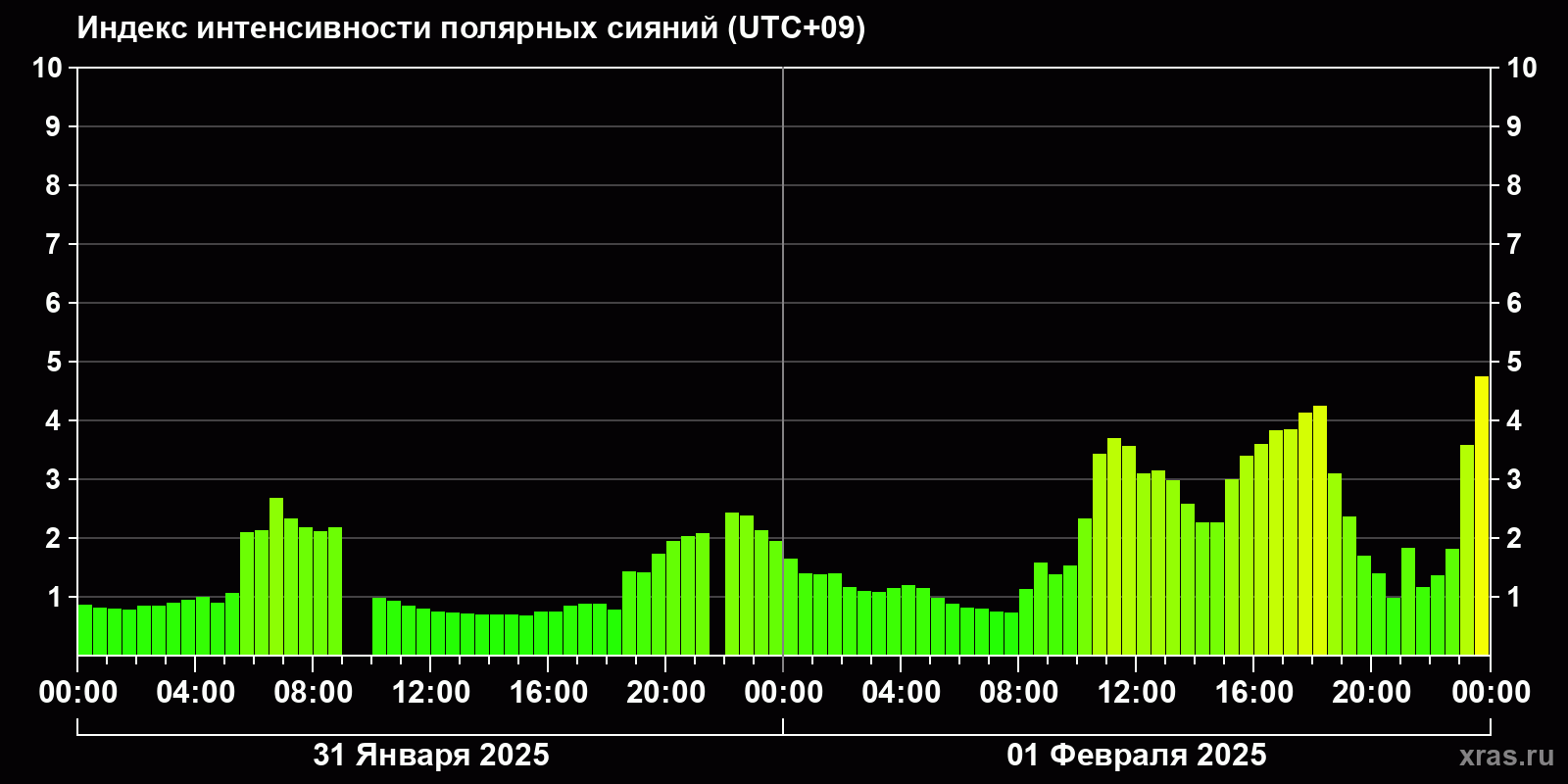 Изменения индекса интенсивности полярных сияний с 2025-01-31 по 2025-02-01 по местному времени