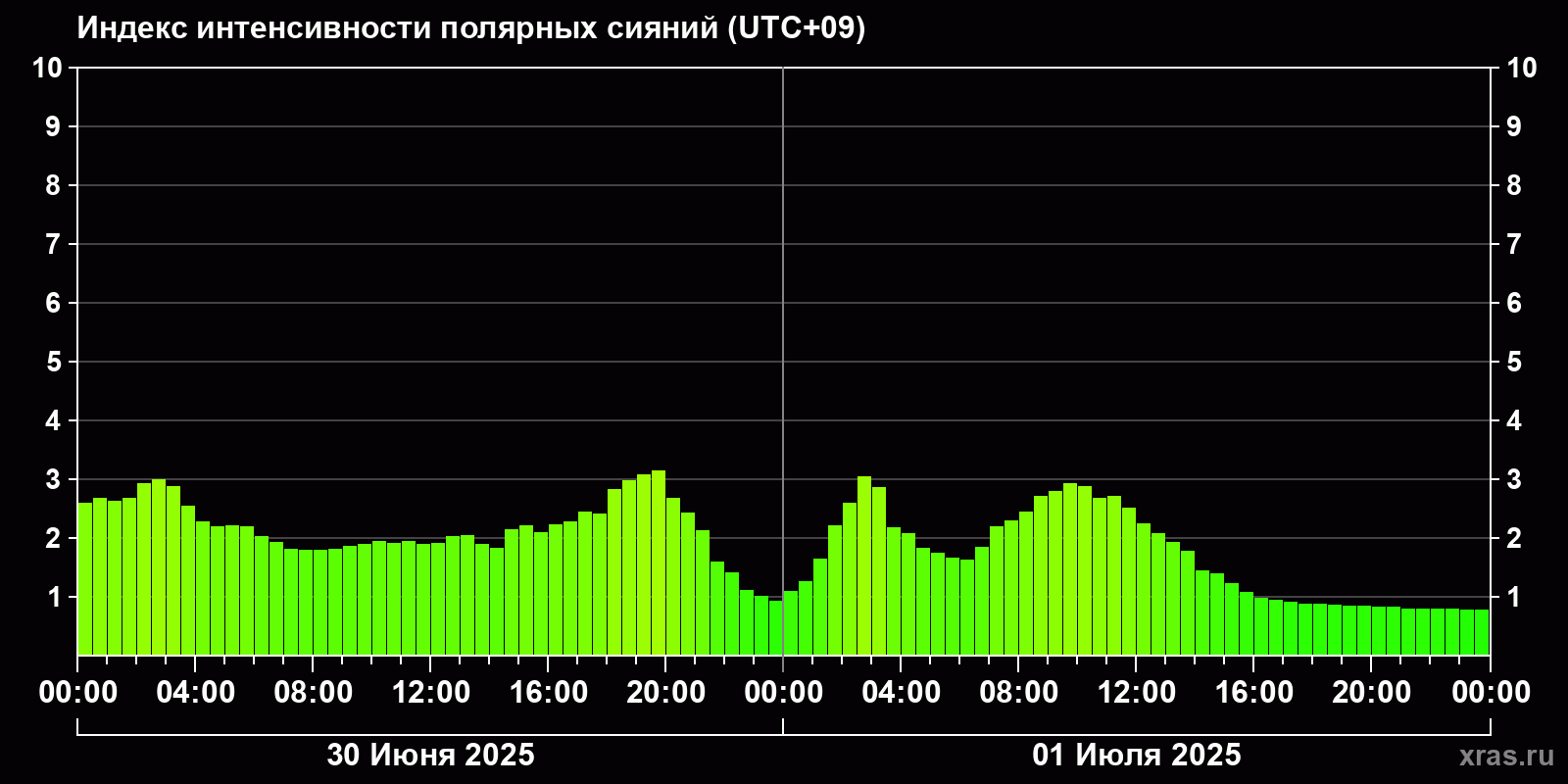 Изменения индекса интенсивности полярных сияний с 2025-06-30 по 2025-07-01 по местному времени