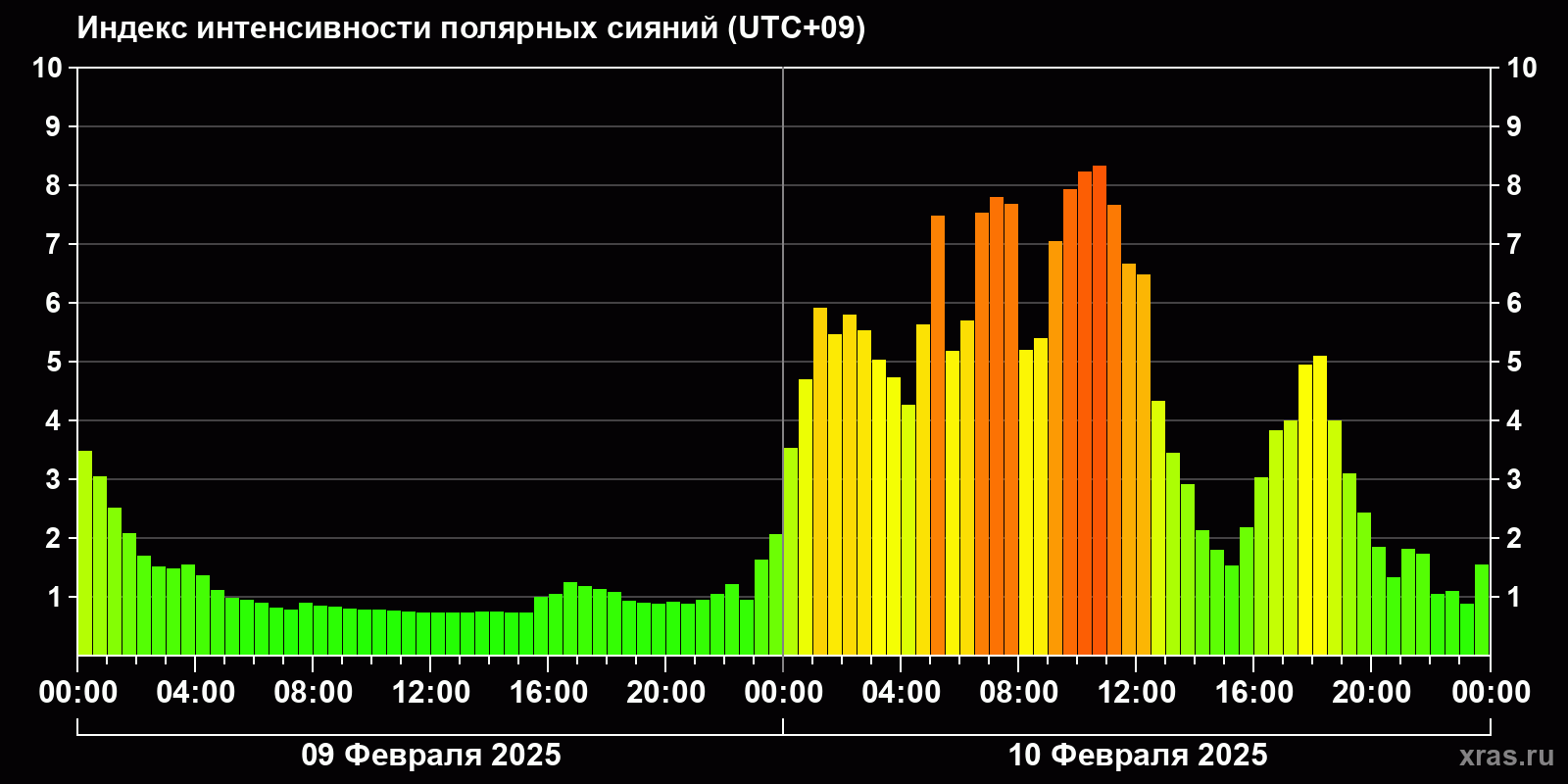 Изменения индекса интенсивности полярных сияний с 2025-02-09 по 2025-02-10 по местному времени