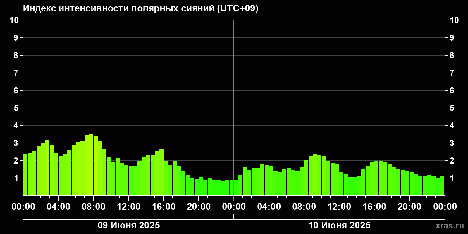 Изменения индекса интенсивности полярных сияний с 2025-06-09 по 2025-06-10 по местному времени