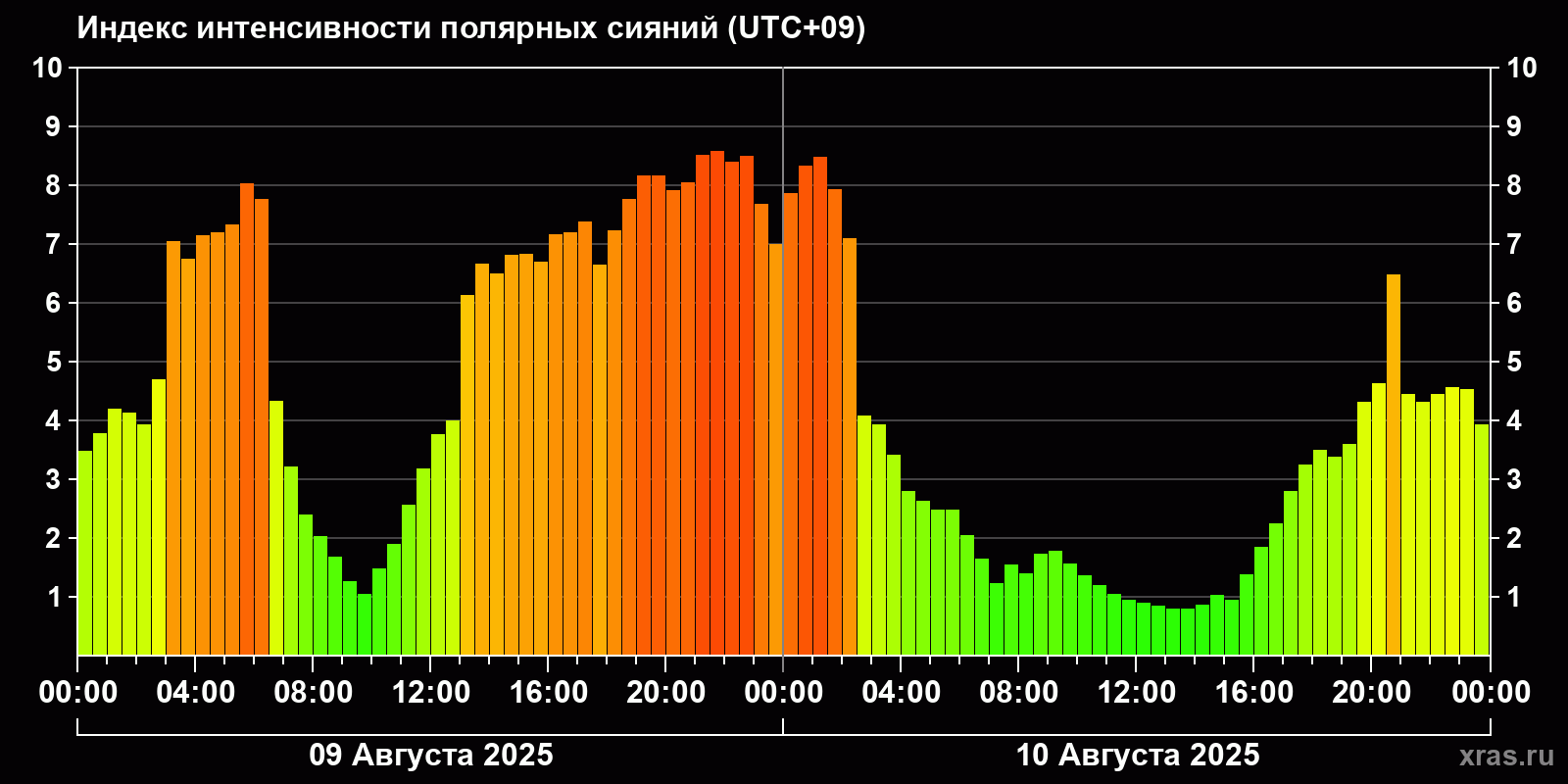 Изменения индекса интенсивности полярных сияний с 2025-08-09 по 2025-08-10 по местному времени