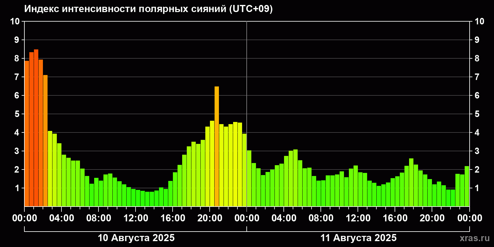Изменения индекса интенсивности полярных сияний с 2025-08-10 по 2025-08-11 по местному времени