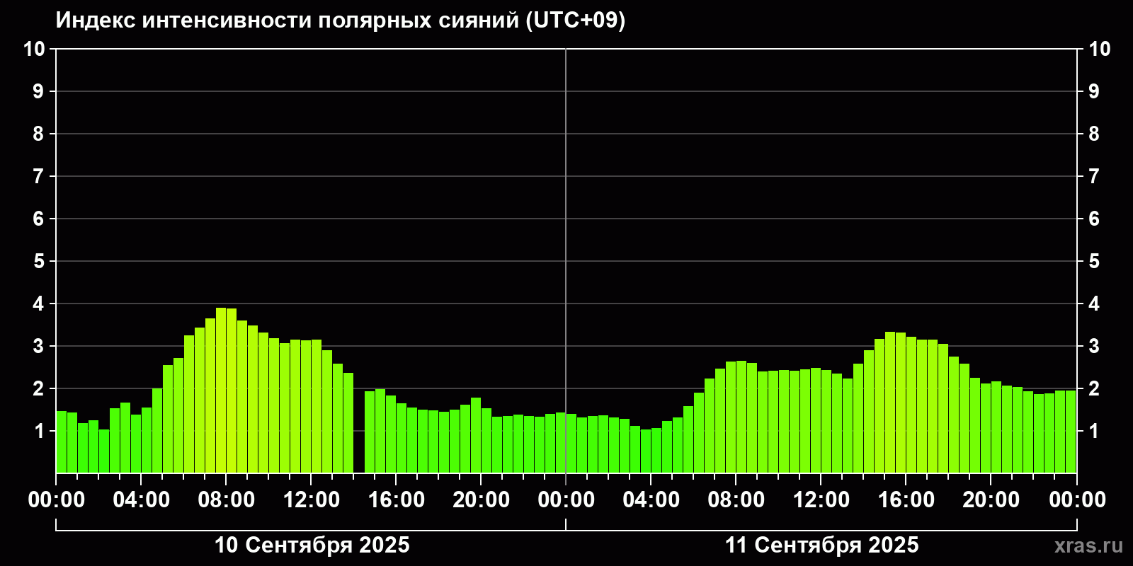 Изменения индекса интенсивности полярных сияний с 2025-09-10 по 2025-09-11 по местному времени