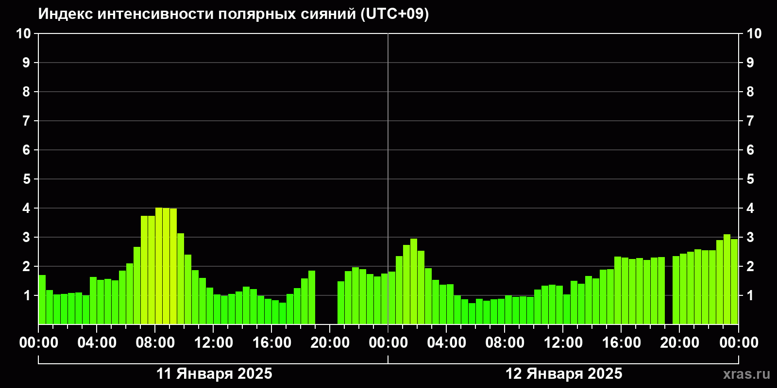 Изменения индекса интенсивности полярных сияний с 2025-01-11 по 2025-01-12 по местному времени