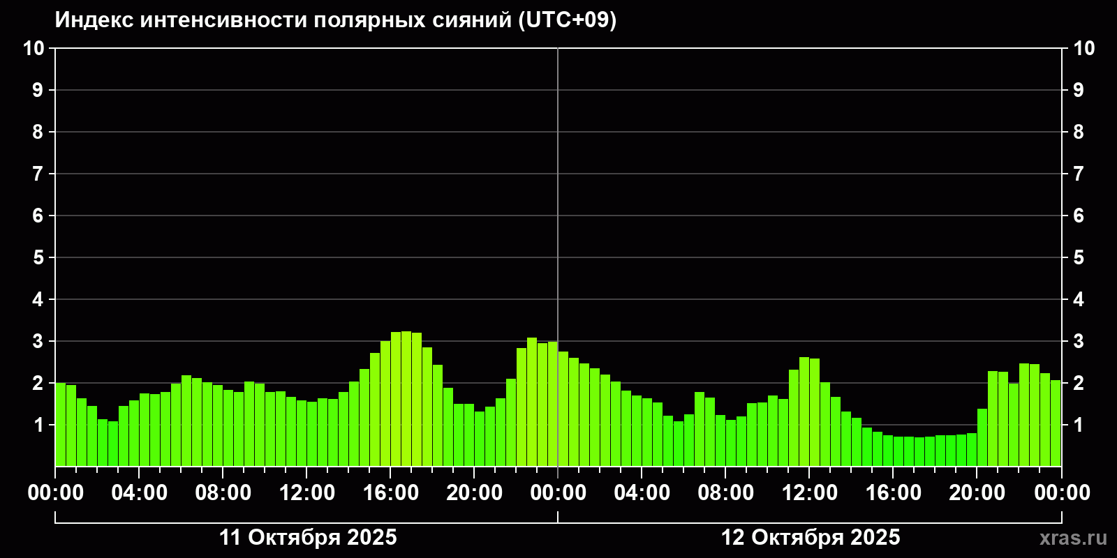 Изменения индекса интенсивности полярных сияний с 2025-10-11 по 2025-10-12 по местному времени