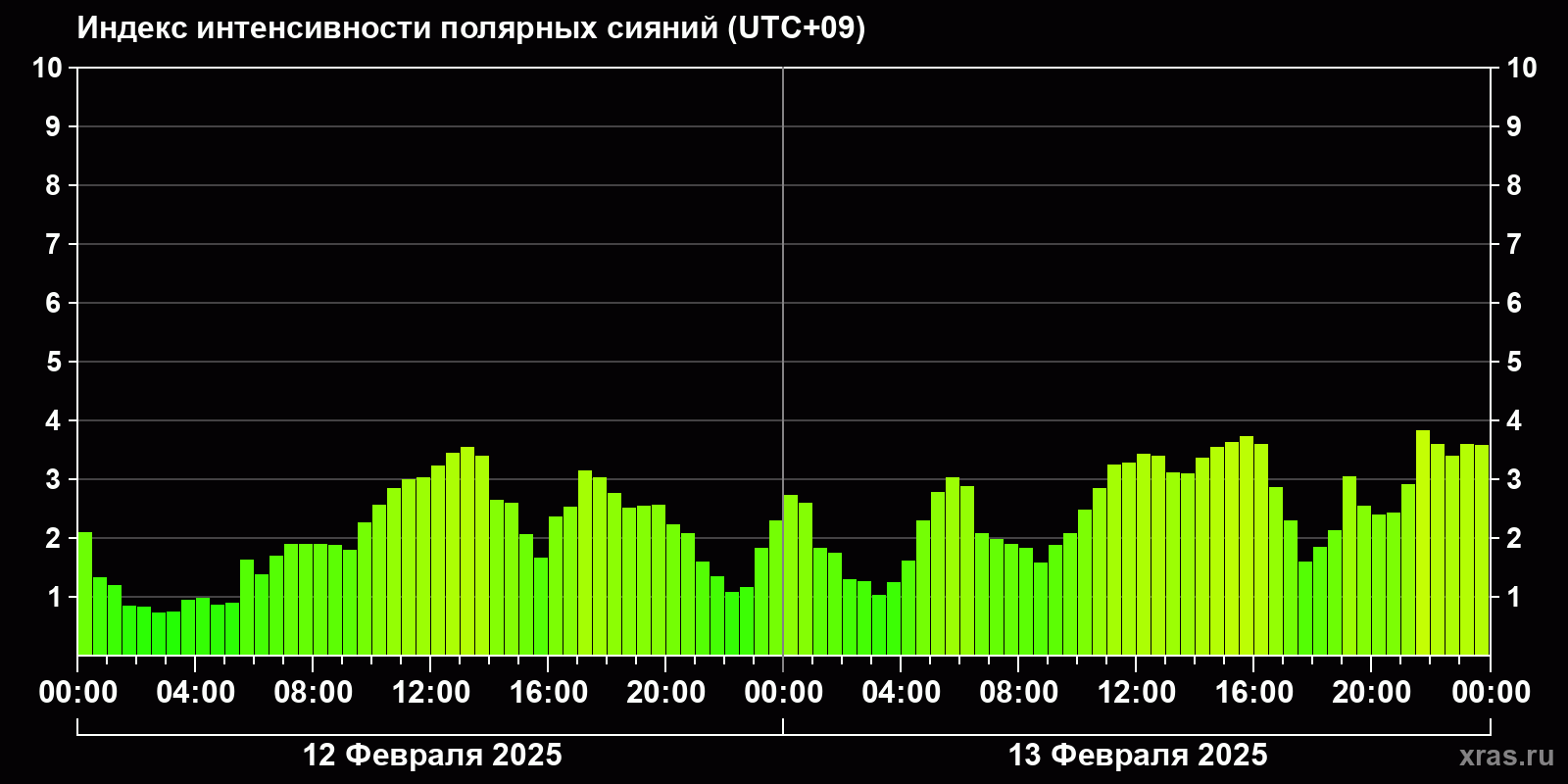 Изменения индекса интенсивности полярных сияний с 2025-02-12 по 2025-02-13 по местному времени