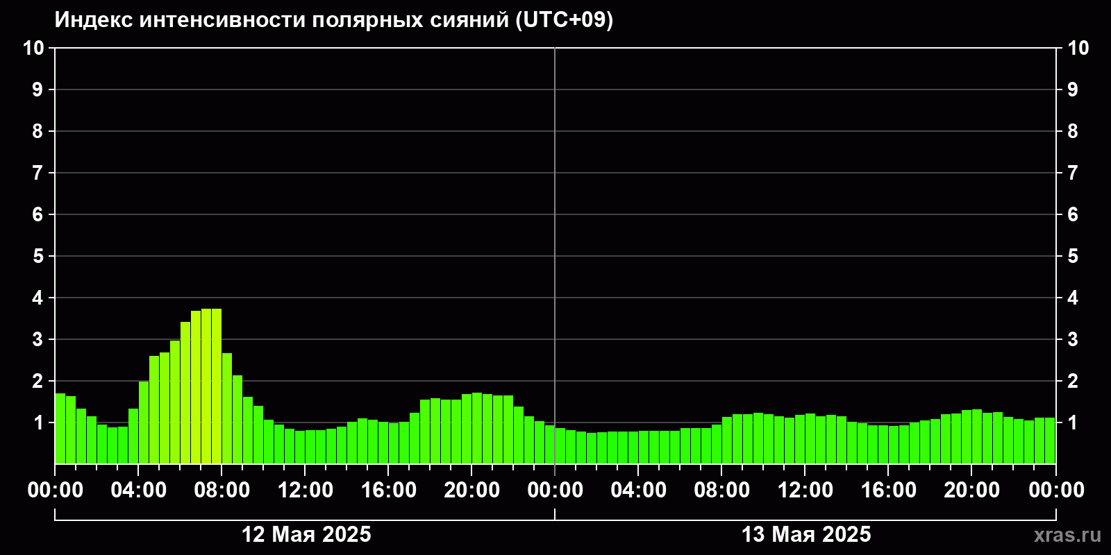 Изменения индекса интенсивности полярных сияний с 2025-05-12 по 2025-05-13 по местному времени
