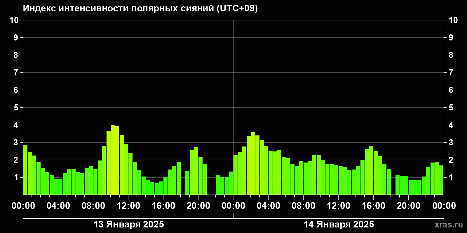 Изменения индекса интенсивности полярных сияний с 2025-01-13 по 2025-01-14 по местному времени