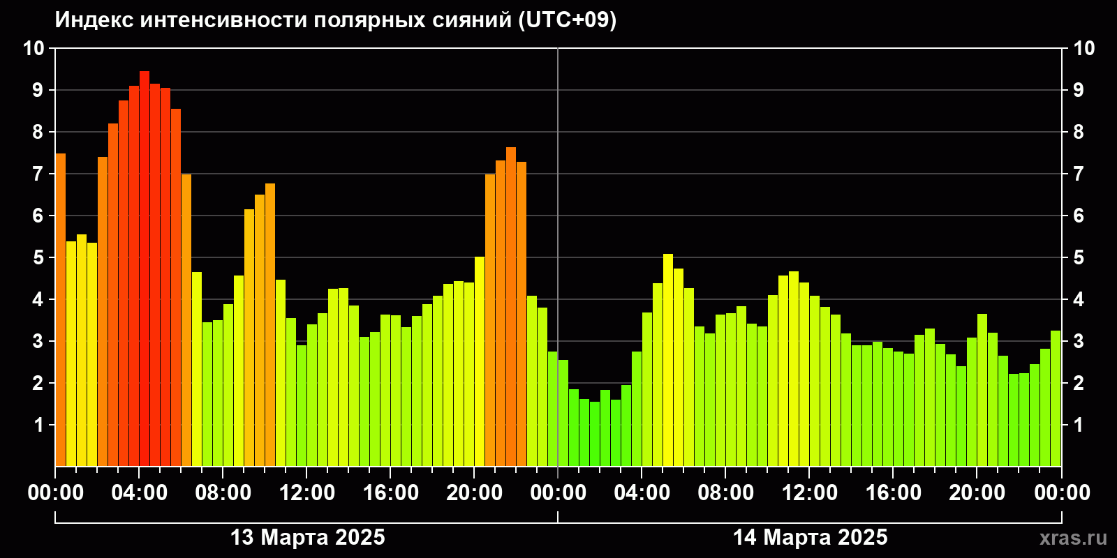 Изменения индекса интенсивности полярных сияний с 2025-03-13 по 2025-03-14 по местному времени