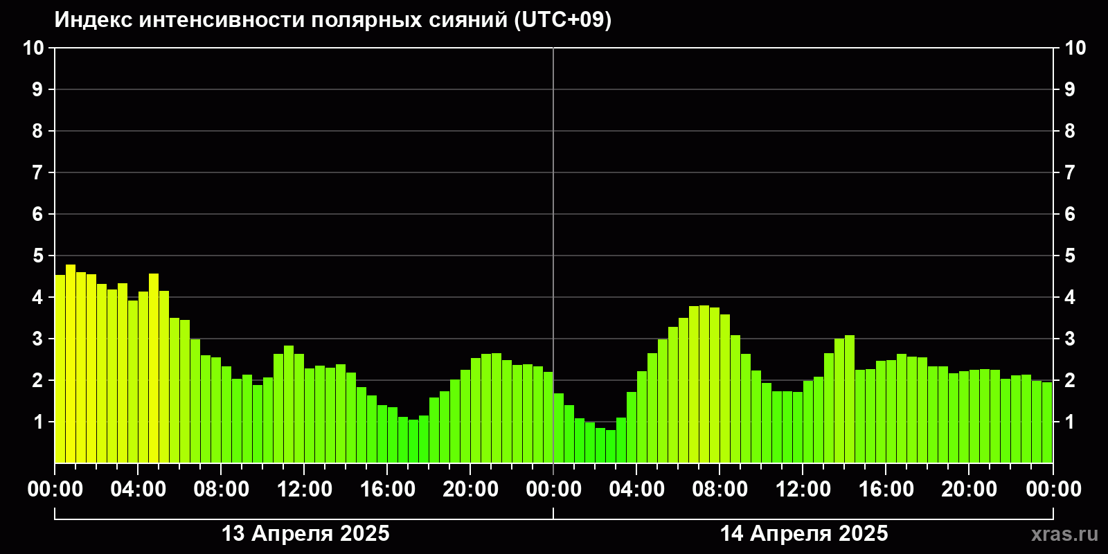 Изменения индекса интенсивности полярных сияний с 2025-04-13 по 2025-04-14 по местному времени