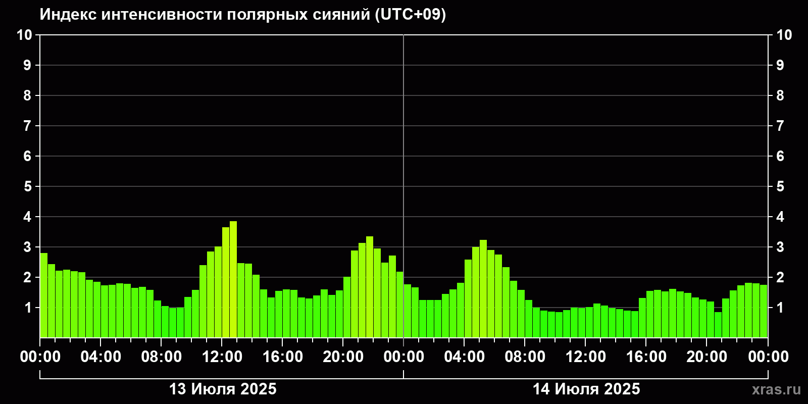 Изменения индекса интенсивности полярных сияний с 2025-07-13 по 2025-07-14 по местному времени