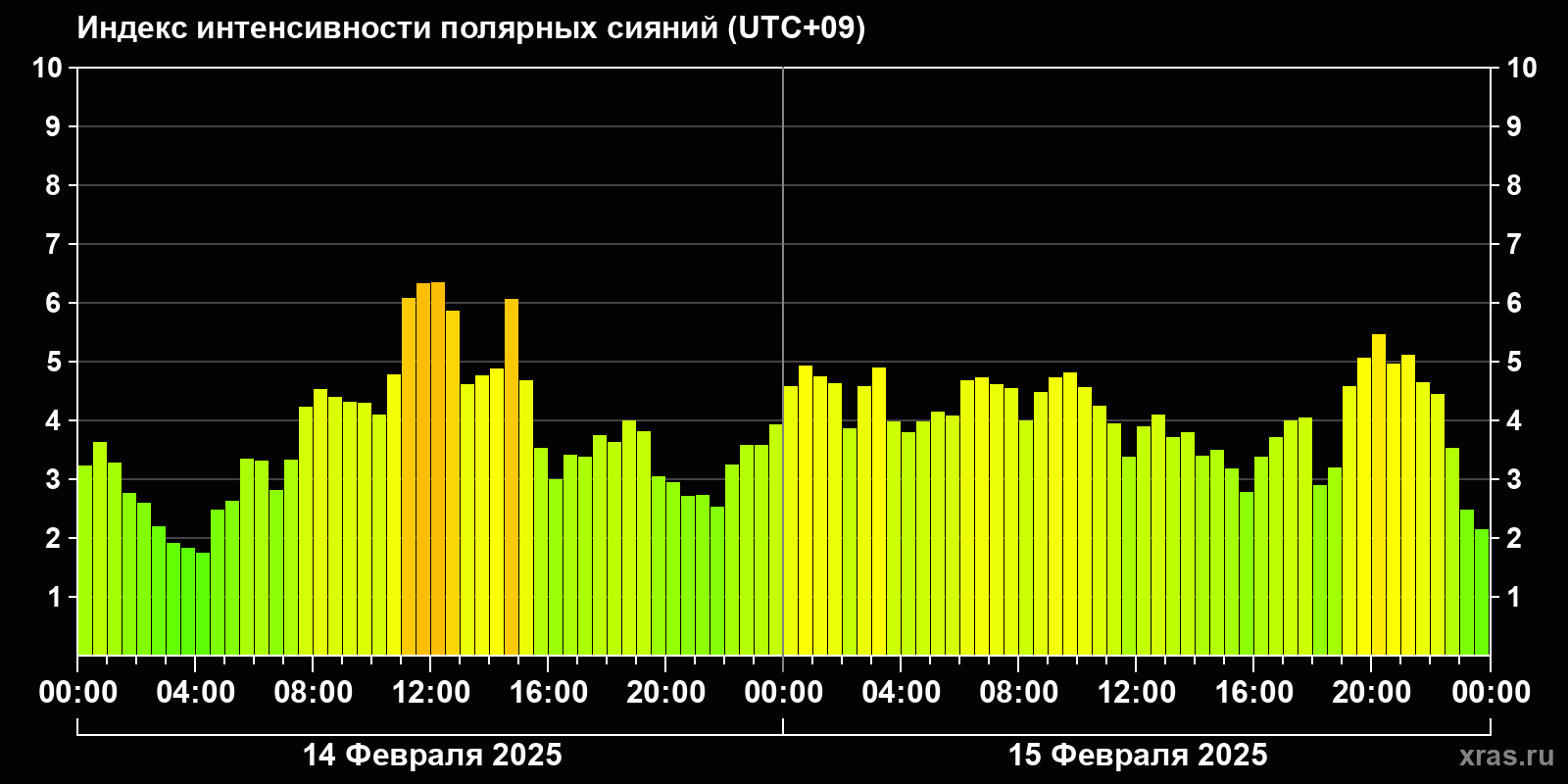 Изменения индекса интенсивности полярных сияний с 2025-02-14 по 2025-02-15 по местному времени