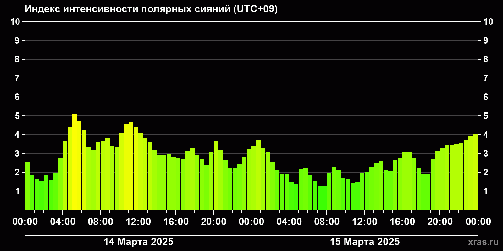 Изменения индекса интенсивности полярных сияний с 2025-03-14 по 2025-03-15 по местному времени