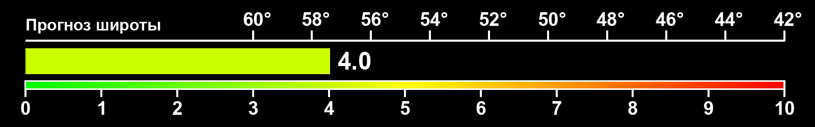 Индекс интенсивности полярных сияний и теоретически возможная широта наблюдений для ночного времени в западном полушарии по состоянию на 2025-03-15 23:56 (конец дня) по местному времени