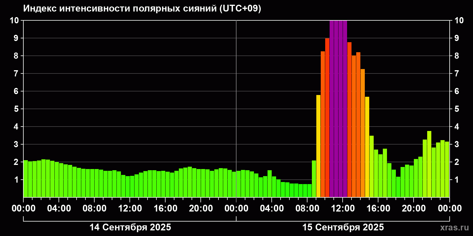 Изменения индекса интенсивности полярных сияний с 2025-09-14 по 2025-09-15 по местному времени