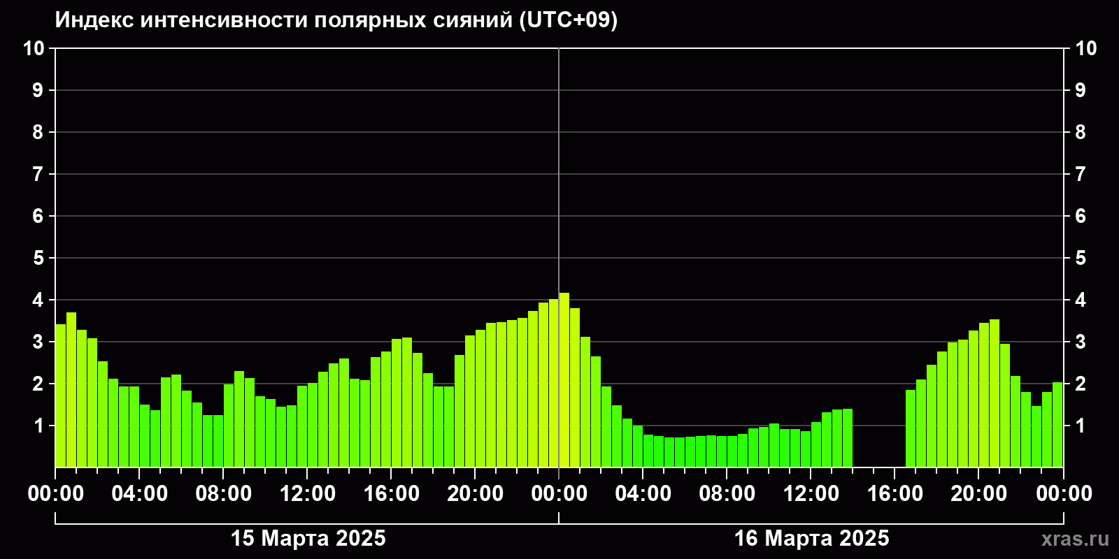 Изменения индекса интенсивности полярных сияний с 2025-03-15 по 2025-03-16 по местному времени