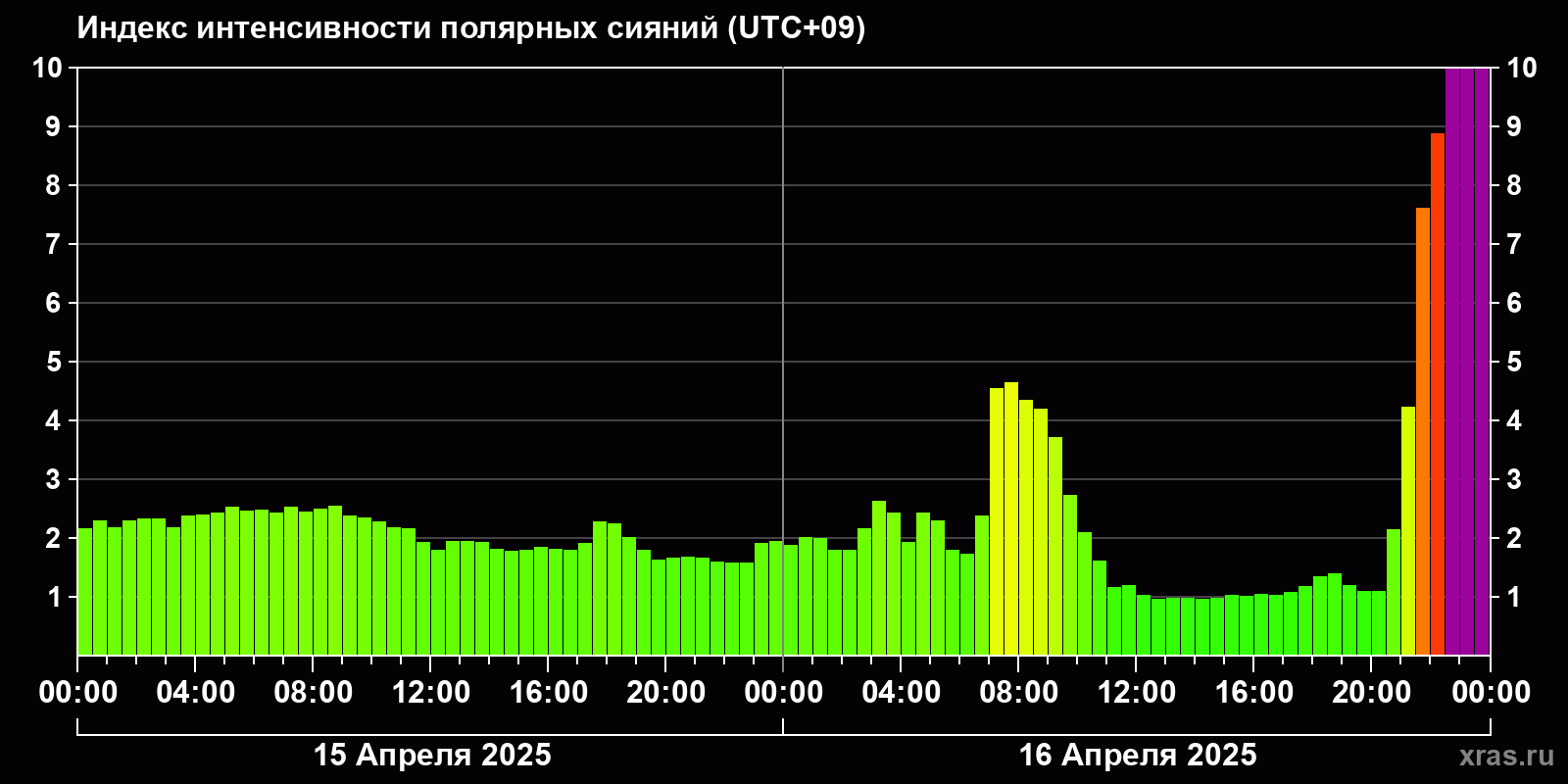 Изменения индекса интенсивности полярных сияний с 2025-04-15 по 2025-04-16 по местному времени