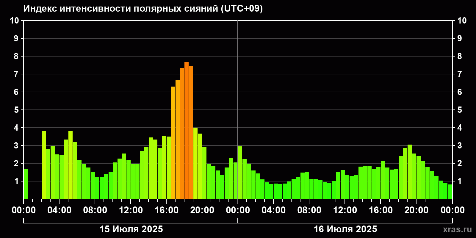 Изменения индекса интенсивности полярных сияний с 2025-07-15 по 2025-07-16 по местному времени