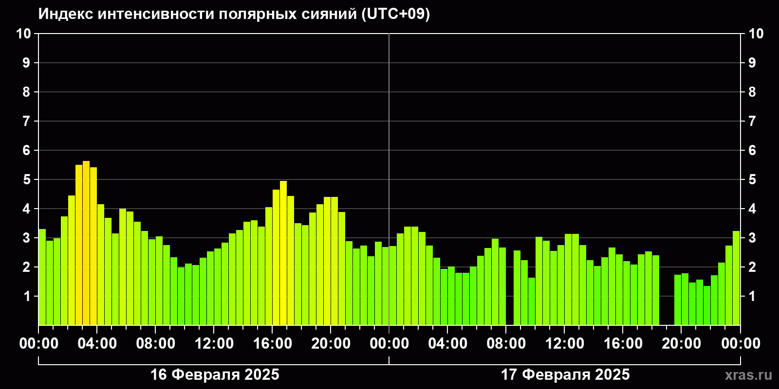 Изменения индекса интенсивности полярных сияний с 2025-02-16 по 2025-02-17 по местному времени
