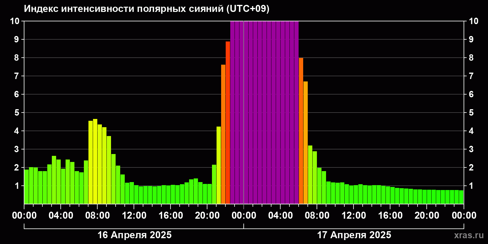 Изменения индекса интенсивности полярных сияний с 2025-04-16 по 2025-04-17 по местному времени