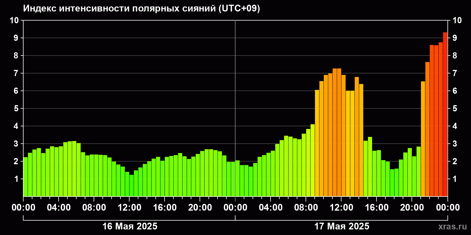 Изменения индекса интенсивности полярных сияний с 2025-05-16 по 2025-05-17 по местному времени