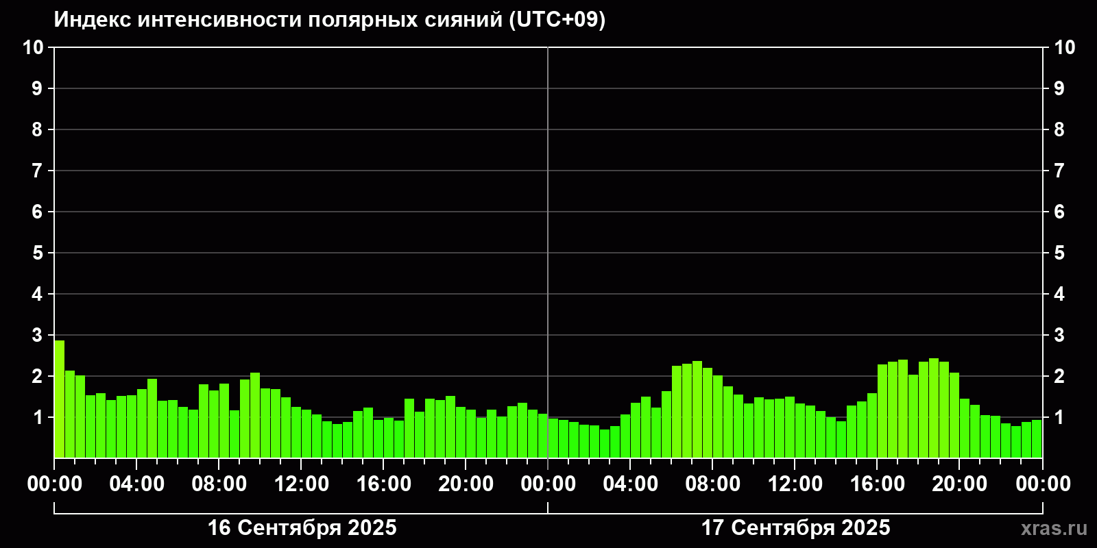 Изменения индекса интенсивности полярных сияний с 2025-09-16 по 2025-09-17 по местному времени