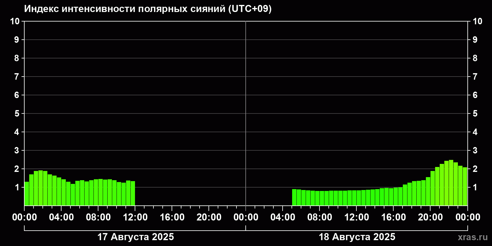 Изменения индекса интенсивности полярных сияний с 2025-08-17 по 2025-08-18 по местному времени