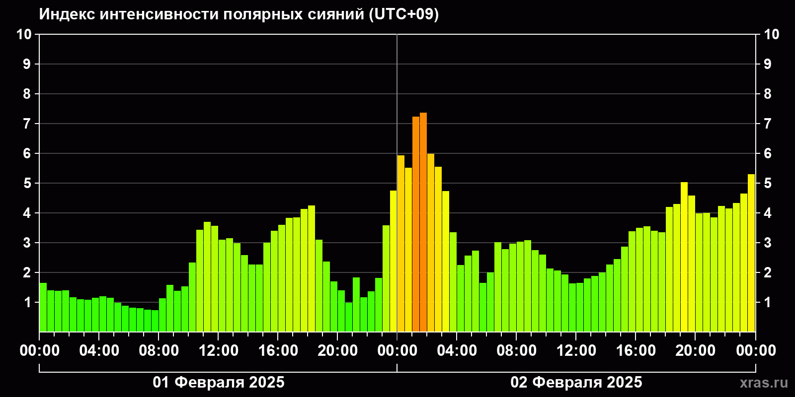 Изменения индекса интенсивности полярных сияний с 2025-02-01 по 2025-02-02 по местному времени