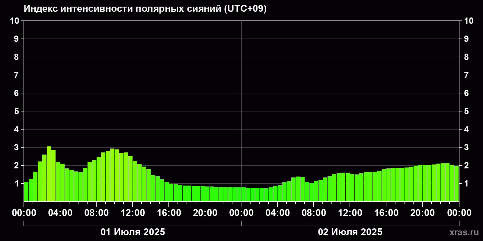 Изменения индекса интенсивности полярных сияний с 2025-07-01 по 2025-07-02 по местному времени