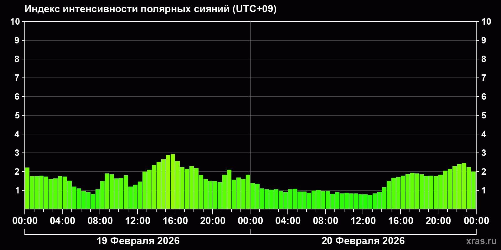 Изменения индекса интенсивности полярных сияний с 2026-02-19 по 2026-02-20 по местному времени