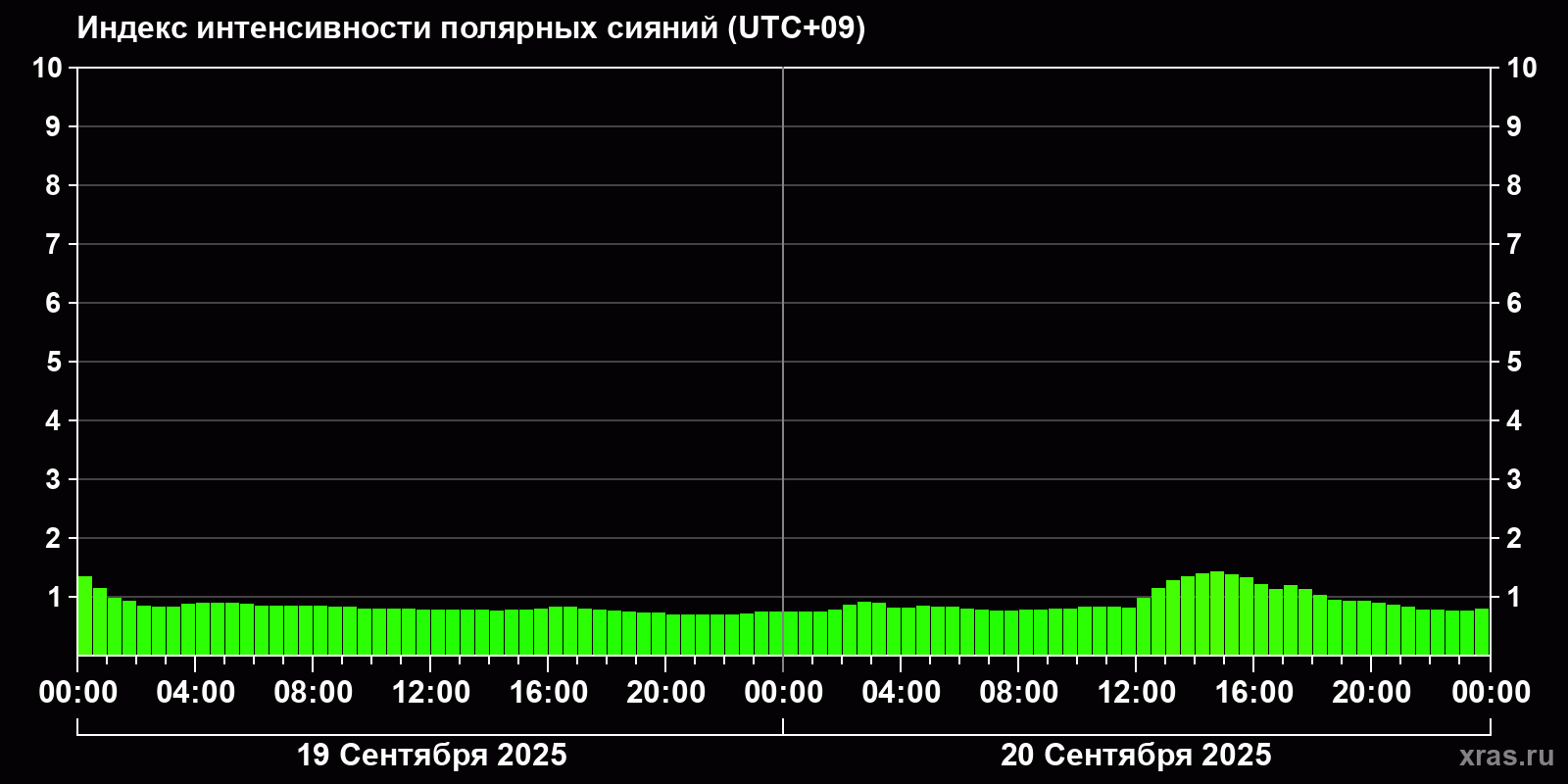 Изменения индекса интенсивности полярных сияний с 2025-09-19 по 2025-09-20 по местному времени