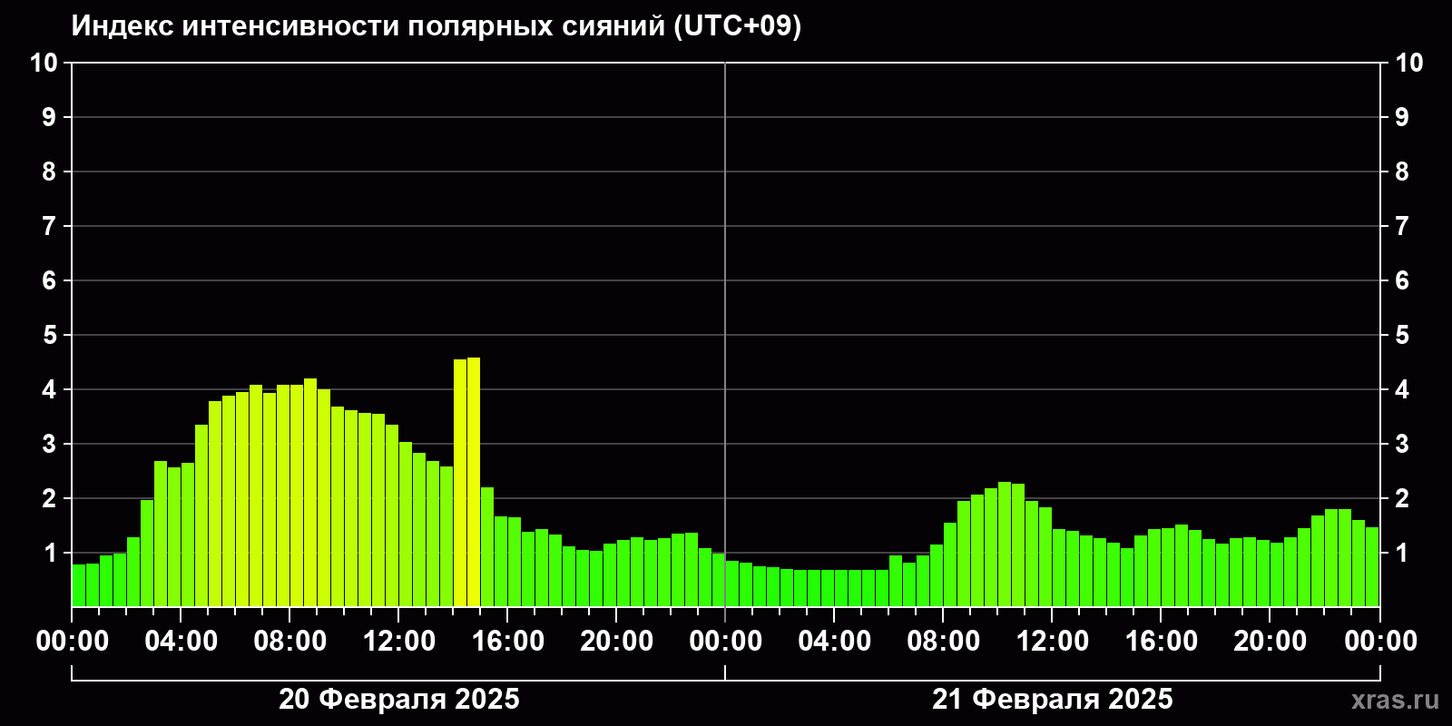 Изменения индекса интенсивности полярных сияний с 2025-02-20 по 2025-02-21 по местному времени