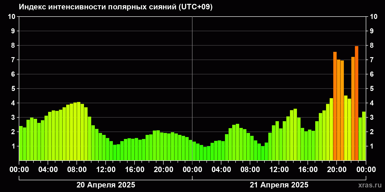 Изменения индекса интенсивности полярных сияний с 2025-04-20 по 2025-04-21 по местному времени