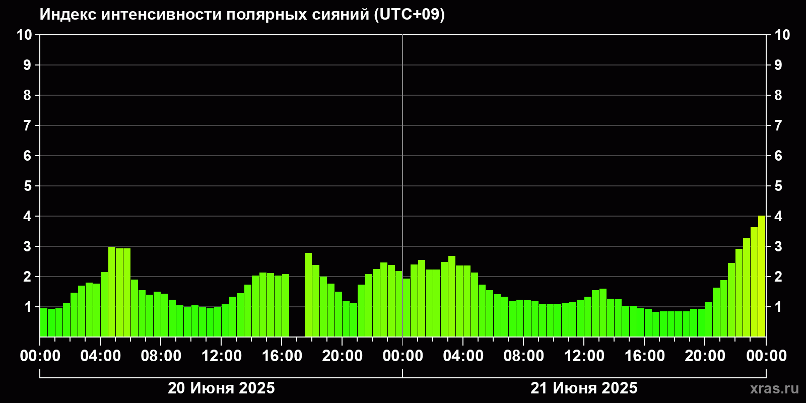 Изменения индекса интенсивности полярных сияний с 2025-06-20 по 2025-06-21 по местному времени