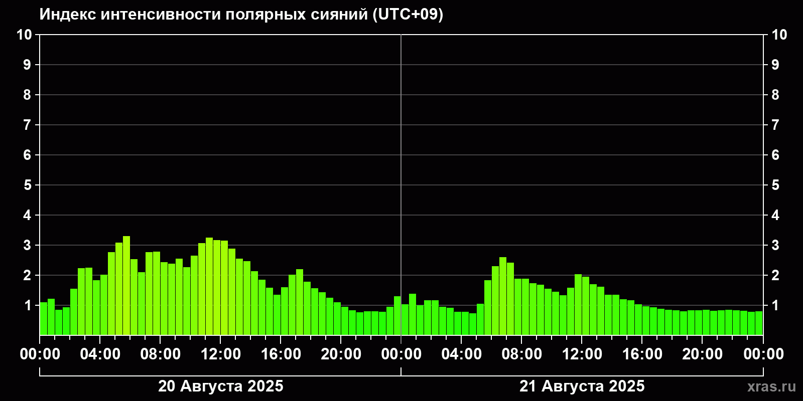 Изменения индекса интенсивности полярных сияний с 2025-08-20 по 2025-08-21 по местному времени