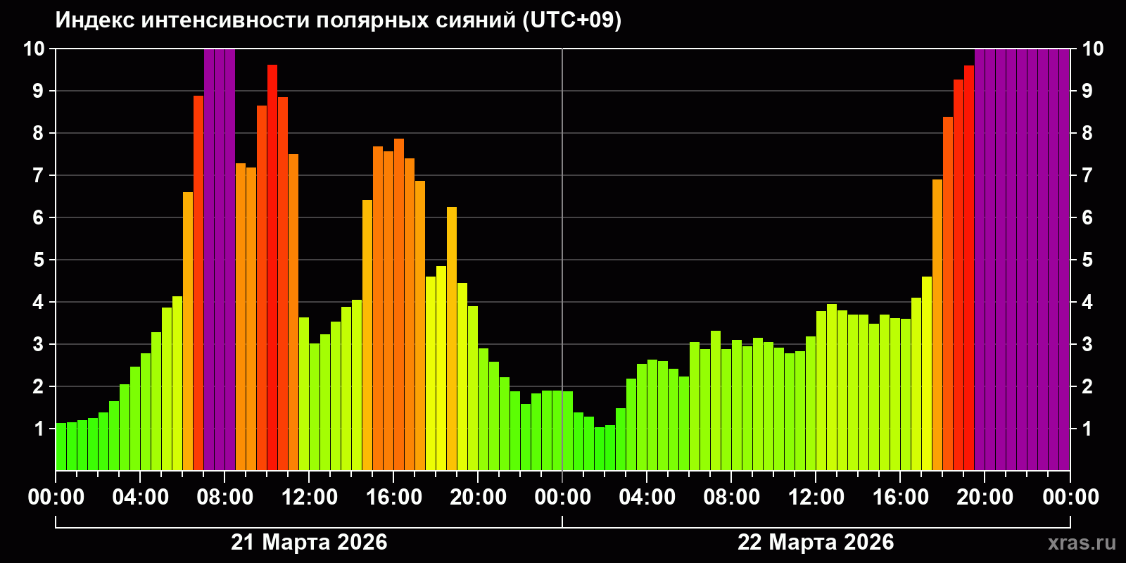 Изменения индекса интенсивности полярных сияний с 2026-03-21 по 2026-03-22 по местному времени