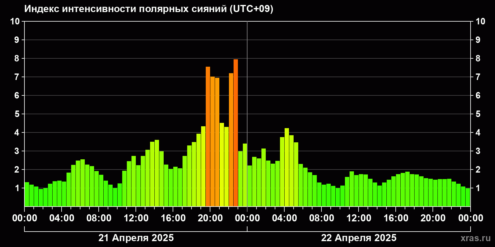 Изменения индекса интенсивности полярных сияний с 2025-04-21 по 2025-04-22 по местному времени