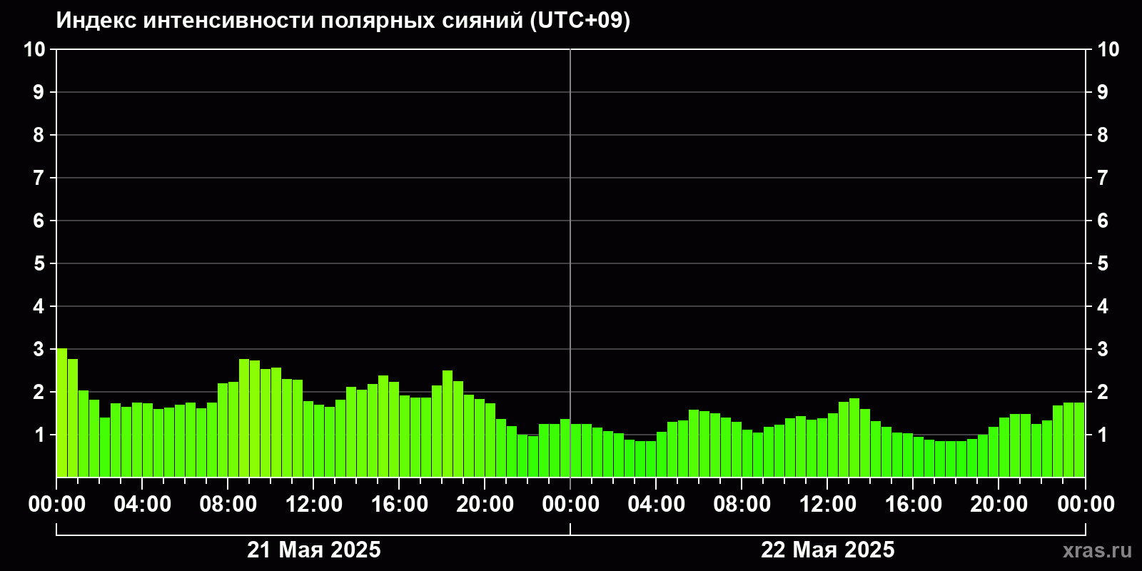 Изменения индекса интенсивности полярных сияний с 2025-05-21 по 2025-05-22 по местному времени