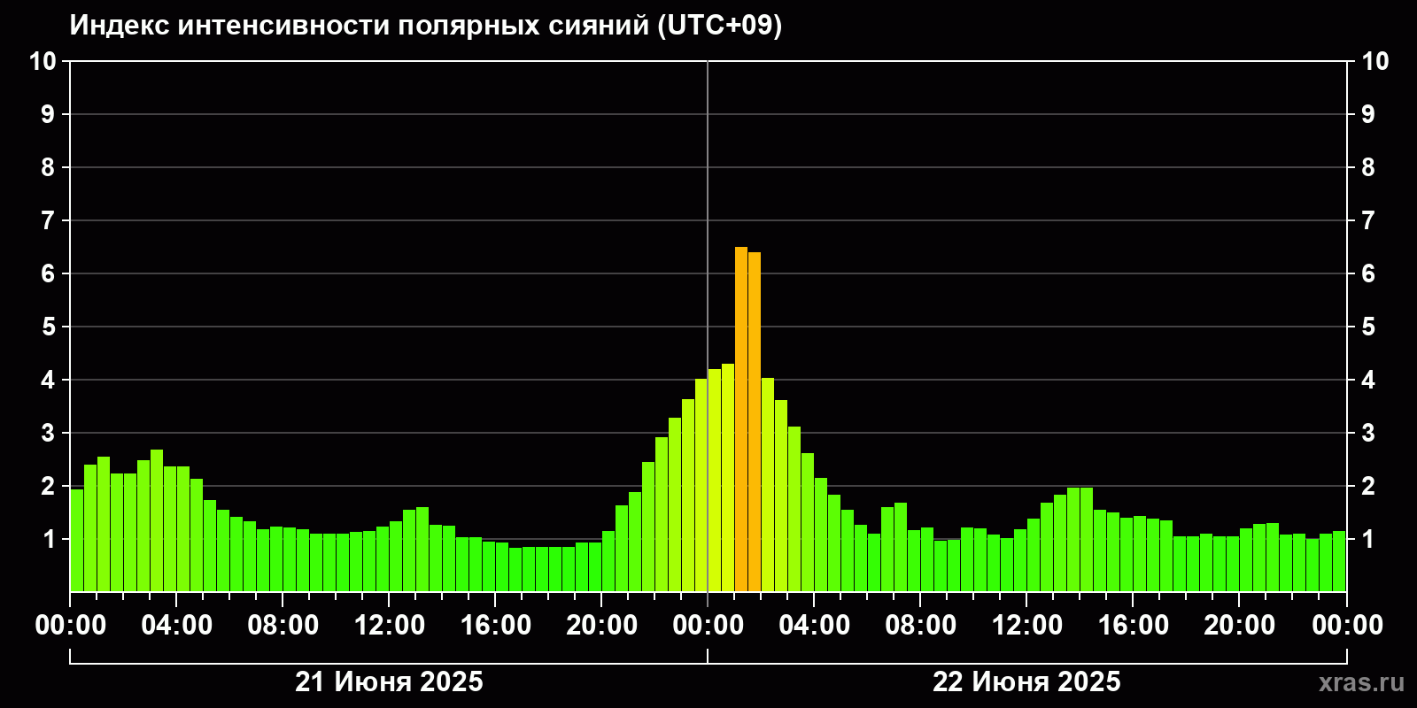 Изменения индекса интенсивности полярных сияний с 2025-06-21 по 2025-06-22 по местному времени