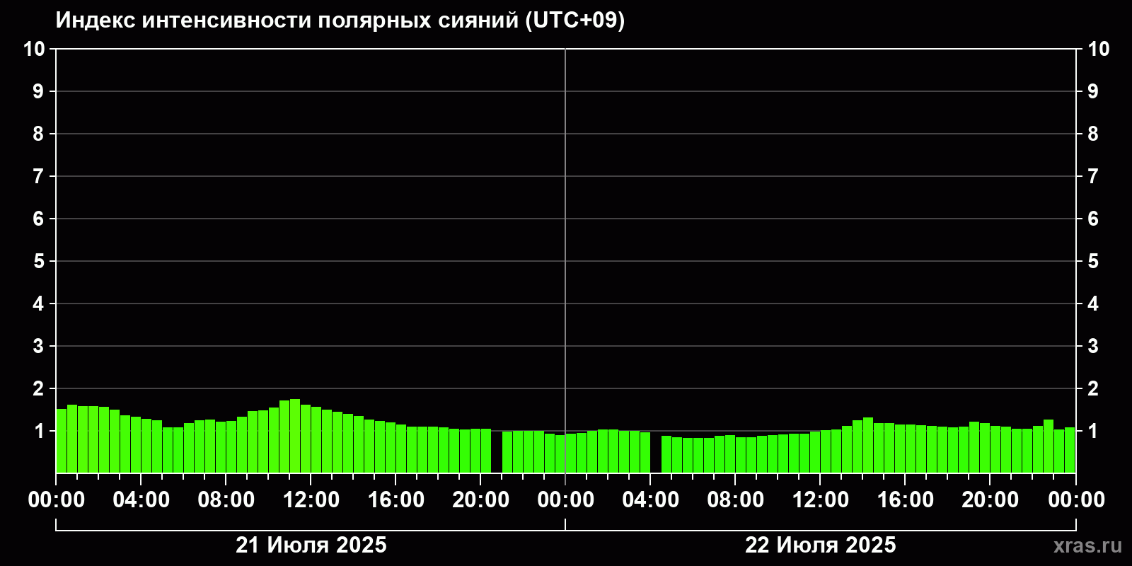 Изменения индекса интенсивности полярных сияний с 2025-07-21 по 2025-07-22 по местному времени