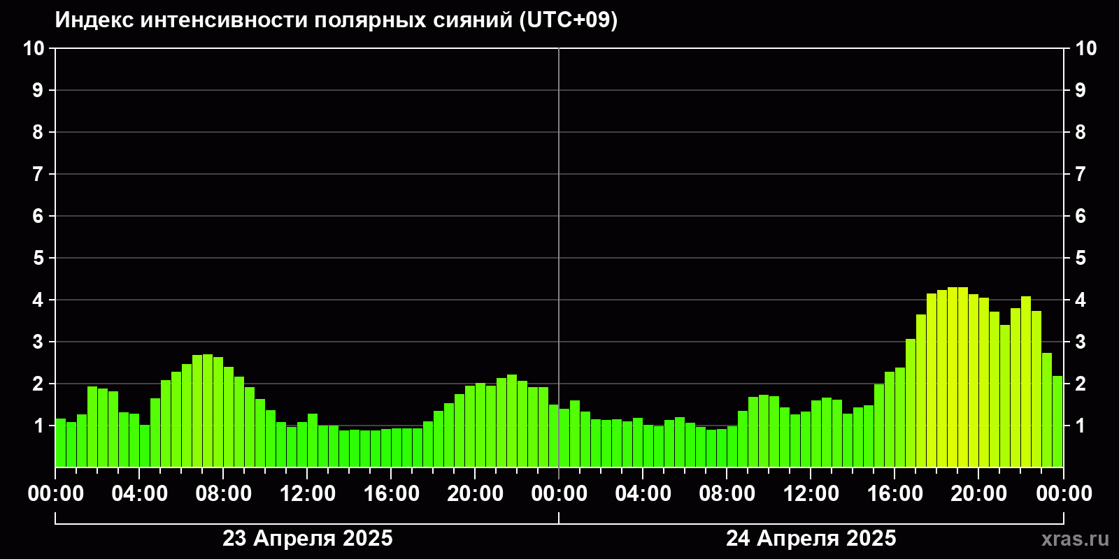 Изменения индекса интенсивности полярных сияний с 2025-04-23 по 2025-04-24 по местному времени