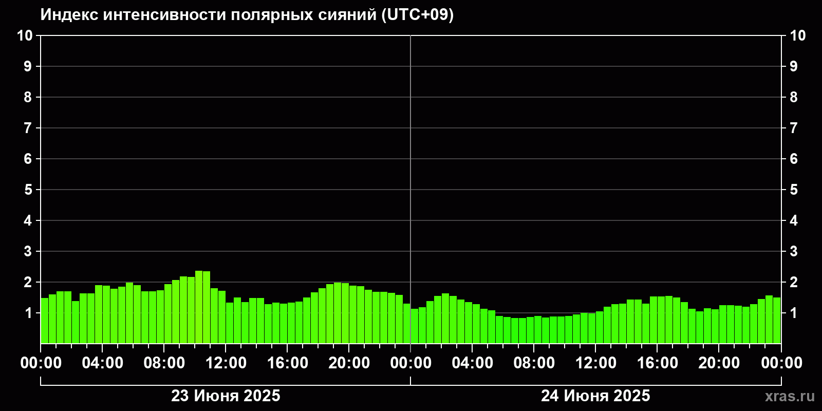 Изменения индекса интенсивности полярных сияний с 2025-06-23 по 2025-06-24 по местному времени