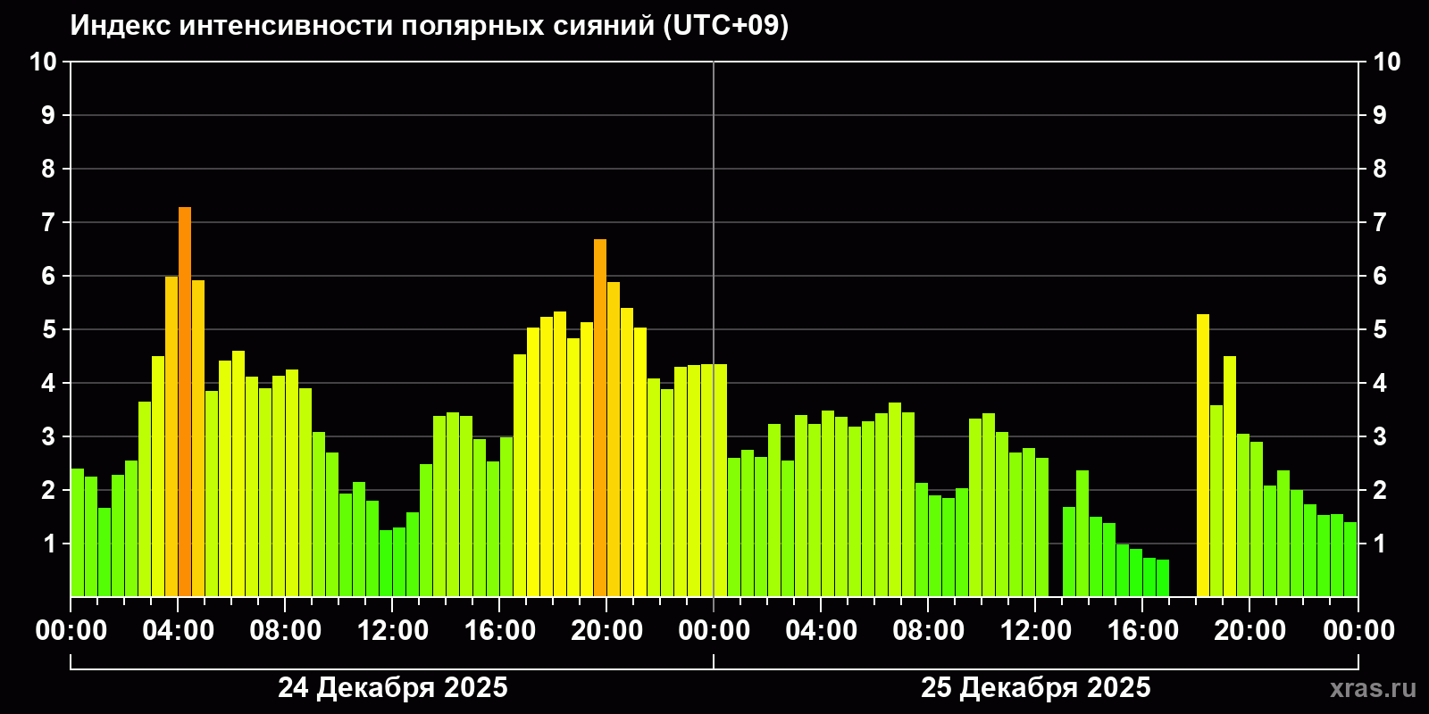 Изменения индекса интенсивности полярных сияний с 2025-12-24 по 2025-12-25 по местному времени