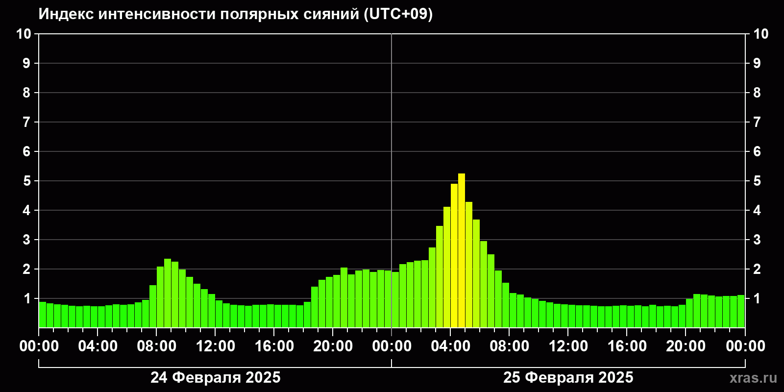 Изменения индекса интенсивности полярных сияний с 2025-02-24 по 2025-02-25 по местному времени
