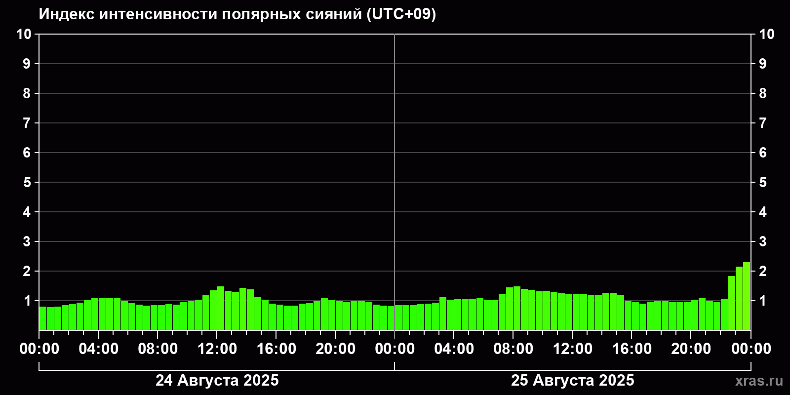 Изменения индекса интенсивности полярных сияний с 2025-08-24 по 2025-08-25 по местному времени